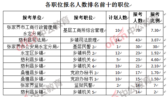 為幫助廣大考生更清晰的了解報名情況,中公教育整理了張家界市各職位的報名人數排名以及競爭比例排名,供廣大考生參考:
