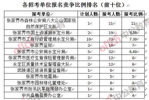 競爭熱門招考單位,前三位依次是:張家界市森林公安局八大公山自然保護區大隊(競爭比例11:1)、張家界市國土資源局永定分局(競爭比例9.5:1)和張家界市工商行政管理局永定分局(競爭比例7.3:1)。