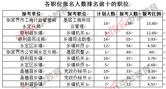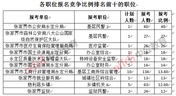 競爭最熱門職位,前三位依次是:張家界市公安局永定分局基層民警2(競爭比例40:1)、張家界市森林公安局八大公山自然保護區大隊基層民警(競爭比例27:1)和張家界市醫療生育保險管理服務局醫療監管(競爭比例26:1)。