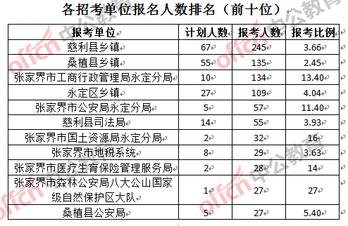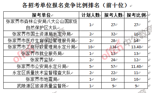 競爭熱門招考單位,前三位依次是:張家界市森林公安局八大公山自然保護區大隊(競爭比例27:1)、張家界市國土資源局永定分局(競爭比例16:1)和張家界市醫療生育保險管理服務局(競爭比例14:1)。