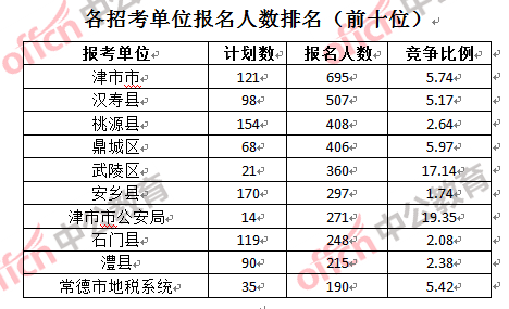 為幫助廣大考生更清晰的了解報(bào)名情況,中公教育整理了常德市各招考單位的報(bào)名人數(shù)排名以及競(jìng)爭(zhēng)比例排名,供廣大考生參考: