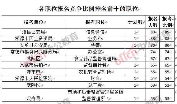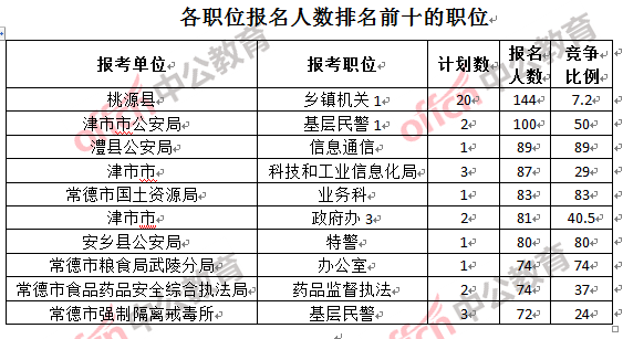 競(jìng)爭(zhēng)熱門職位,前三位依次是:澧縣公安局信息通信(競(jìng)爭(zhēng)比例89:1)、常德市國(guó)土資源局業(yè)務(wù)科(競(jìng)爭(zhēng)比例83:1)和安鄉(xiāng)縣公安局 特警(競(jìng)爭(zhēng)比例80:1)。
