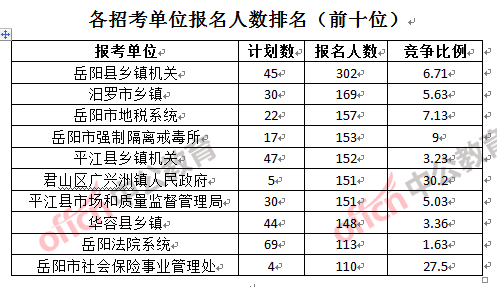 為幫助廣大考生更清晰的了解報(bào)名情況,中公教育整理了岳陽(yáng)各招考單位的報(bào)名人數(shù)排名以及競(jìng)爭(zhēng)比例排名,供廣大考生參考: