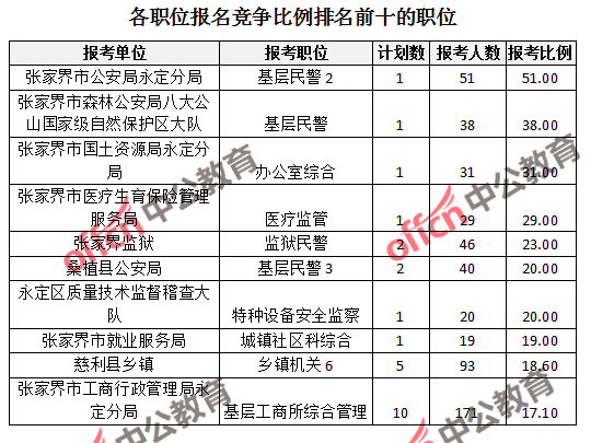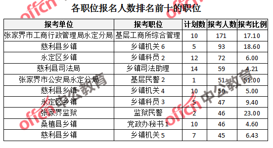 競爭熱門職位,前三位依次是:張家界市公安局永定分局基層民警2 (競爭比例51:1)、張家界市森林公安局八大公山自然保護區(qū)大隊基層民警(競爭比例38:1)、張家界市國土資源局永定分局辦公室綜合(競爭比例31:1)。
