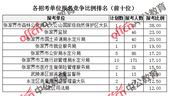 競爭熱門招考單位,前三位依次是:張家界市森林公安局八大公山自然保護區(qū)大隊(競爭比例38:1)、張家界監(jiān)獄(競爭比例23:1)、張家界市國土資源局永定分局(競爭比例20:1)。