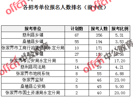 為幫助廣大考生更清晰的了解報名情況,中公教育整理了張家界市各招考單位的報名人數(shù)排名以及競爭比例排名,供廣大考生參考:
