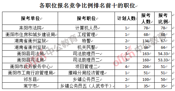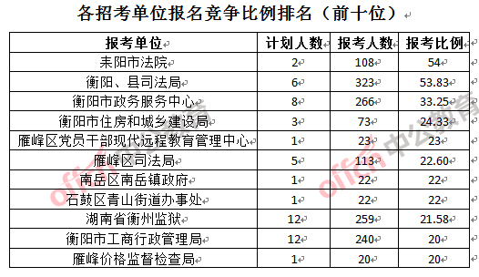 競(jìng)爭(zhēng)熱門招考單位,前三位依次是:耒陽市法院(競(jìng)爭(zhēng)比例54:1)、衡陽縣司法局(競(jìng)爭(zhēng)比例53.83:1)和衡陽市政務(wù)服務(wù)中心(競(jìng)爭(zhēng)比例33.25:1)。