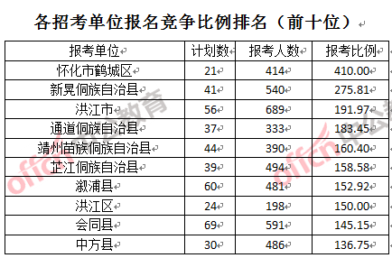 競爭熱門招考單位,前三位依次是:懷化市鶴城區(競爭比例410:1)、新晃侗族自治縣(競爭比例275:1)和洪江市(競爭比例191:1)。