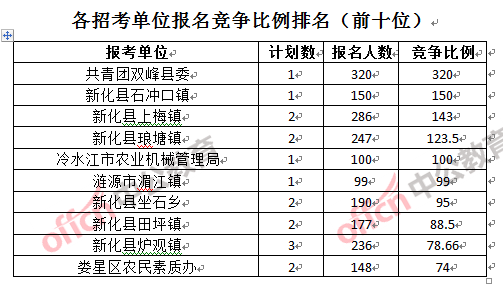 競爭熱門招考單位,前三位依次是:共青團(tuán)雙峰縣委(競爭比例320:1)、新化縣石沖口鎮(zhèn)(競爭比例150:1)和新化縣上梅鎮(zhèn)(競爭比例143:1)。
