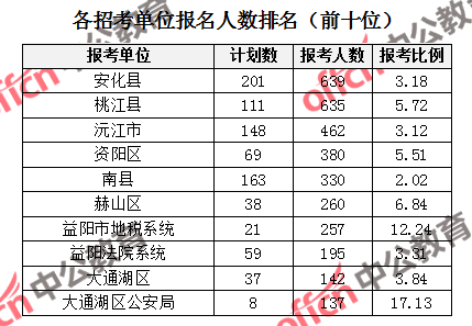 為幫助廣大考生更清晰的了解報名情況,中公網(wǎng)校整理了益陽市各招考單位的報名人數(shù)排名以及競爭比例排名,供廣大考生參考: