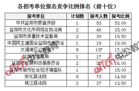 競爭熱門招考單位,前三位依次是:中共益陽市委宣傳部(競爭比例53:1)、益陽市文化市場綜合執(zhí)法局(競爭比例23:1)、益陽市質(zhì)量技術(shù)監(jiān)督局(競爭比例19.5:1)。