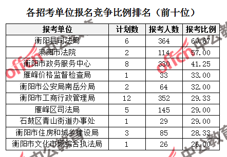 競爭熱門招考單位,前三位依次是:衡陽縣司法局(競爭比例60.67:1)、耒陽市法院(競爭比例57:1)和衡陽市政務(wù)服務(wù)中心(競爭比例41.25:1)。