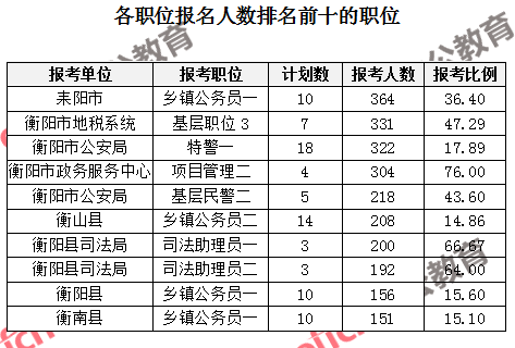 為幫助廣大考生更清晰的了解報(bào)名情況,中公網(wǎng)校整理了衡陽市各職位的報(bào)名人數(shù)排名以及競爭比例排名,供廣大考生參考: