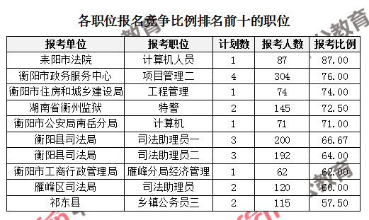 競爭熱門職位,前三位依次是:耒陽市法院計(jì)算機(jī)人員(競爭比例87:1)、衡陽市政務(wù)服務(wù)中心項(xiàng)目管理二(競爭比例76:1)、衡陽市住房和城鄉(xiāng)建設(shè)局工程管理(競爭比例74:1)。