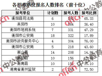 為幫助廣大考生更清晰的了解報名情況,中公網校整理了衡陽市各招考單位的報名人數排名以及競爭比例排名,供廣大考生參考:
