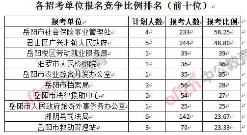 競爭熱門招考單位,前三位依次是:岳陽市社會保險事業管理處(競爭比例58.25:1)、君山區廣興洲鎮人民政府(競爭比例48.8:1)和岳陽樓區勞動就業服務局(競爭比例39:1)。
