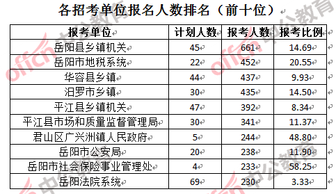為幫助廣大考生更清晰的了解報名情況,中公網校整理了岳陽市各招考單位的報名人數排名以及競爭比例排名,供廣大考生參考: