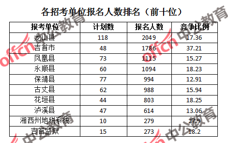 為幫助廣大考生更清晰的了解報名情況,中公網校整理了湘西州各招考單位的報名人數排名以及競爭比例排名,供廣大考生參考: