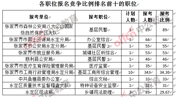 競爭最熱門職位,前三依次是:張家界市森林公安局八大公山自然保護區大隊基層民警(競爭比例89:1)、張家界市國土資源局永定分局辦公室綜合(競爭比例64:1)和張家界市公安局永定分局基層民警2(競爭比例55:1)。