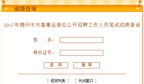 點(diǎn)擊進(jìn)入>>>2017山東德州市直事業(yè)單位招聘筆試成績(jī)查詢?nèi)肟?/a>