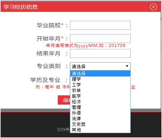 在填寫學習經歷時要專門填寫“專業類別”,很多考生對自己的專業類別不是很清楚,考生可以根據自己的學歷情況,選擇相應專業大類,不能確定的填寫其他。