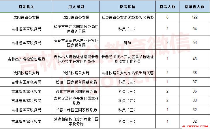 報名通過審核人數(shù)前十的職位主要集中在吉林省國家稅務(wù)局、吉林出入境檢驗檢疫局、沈陽鐵路公安局等部門,具體信息如下: