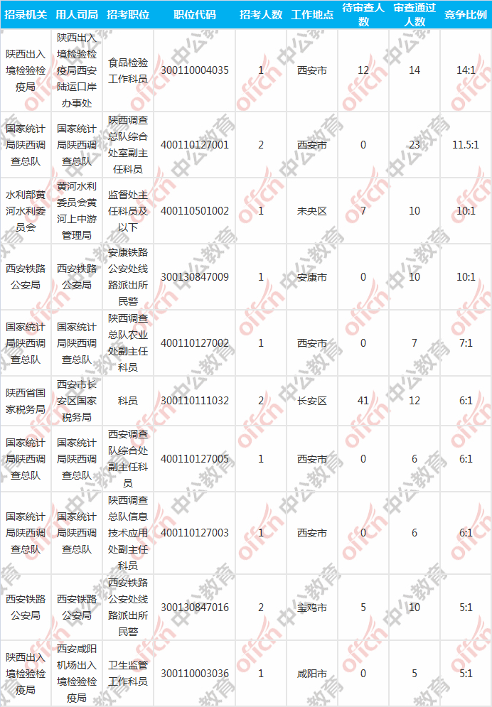報(bào)名通過審核人數(shù)前十的職位主要集中在陜西出入境檢驗(yàn)檢疫局、國家統(tǒng)計(jì)局陜西調(diào)查總隊(duì)、西安鐵路公安局等部門,具體信息如下: