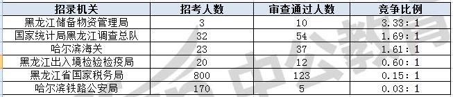 截止到30日18時(shí),通過審核人數(shù)前三位的部門依次是:黑龍江省國(guó)家稅務(wù)局、國(guó)家統(tǒng)計(jì)局黑龍江調(diào)查總隊(duì)、哈爾濱海關(guān),三部門通過審核總?cè)藬?shù)達(dá)214人,占通過審核總?cè)藬?shù)的88.8%。