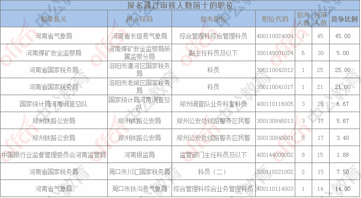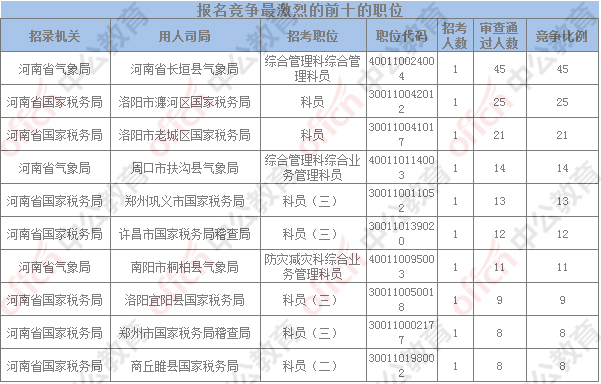 報名通過審核人數前十的職位主要集中在河南省氣象局、河南煤礦安全監察局、河南省國家稅務局、國家統計局河南調查總隊等部門,具體信息如下: