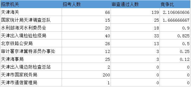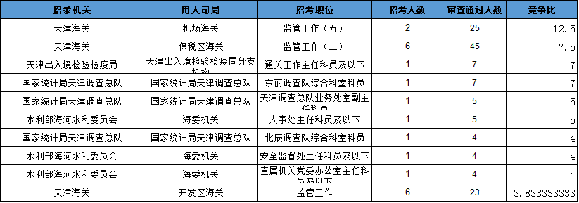 報(bào)名通過審核人數(shù)前十的職位主要集中在天津海關(guān)、天津出入境檢驗(yàn)檢疫局等部門,具體信息如下:
