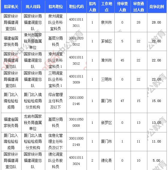報名通過審核人數(shù)前十的職位主要集中在國家統(tǒng)計局福建調(diào)查總隊、福建省國家稅務(wù)局、廈門出入境檢驗檢疫局等部門,具體信息如下:
