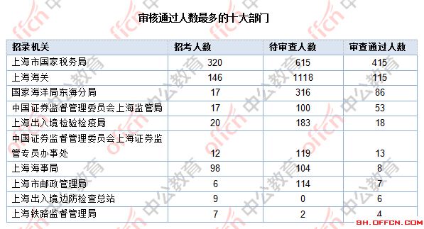 截止到31日10時,通過審核人數前三位的部門依次是:上海市國家稅務局,上海海關,國家海洋局東海分局,三部門通過審核總人數達616人,占通過審核總人數的83.58%。