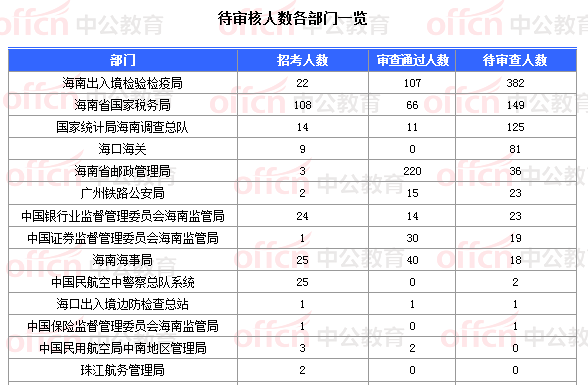 截止到31日18時,通過審核人數前三位的部門依次是:海南省郵政管理局、海南出入境檢驗檢疫局、海南省國家稅務局,三部門通過審核總人數達393人,占通過審核總人數的77.67%。