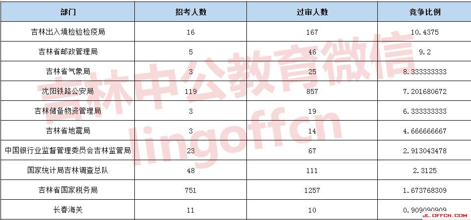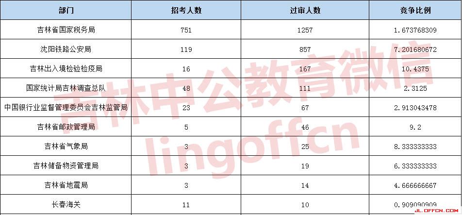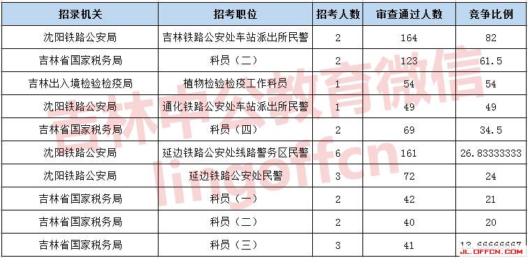 報名通過審核人數(shù)前十的職位主要集中在沈陽鐵路公安局、吉林國家稅務(wù)局、吉林出入境檢疫檢驗局等部門,具體信息如下: