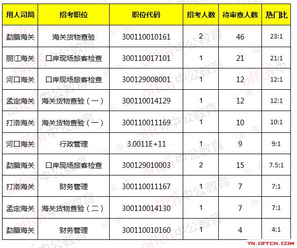 國考報名第二天人數總待審核的共2380人,海關占4.8%,當前昆明海關勐臘海關,職位代碼300110010161的崗位相比報名人數為多,招2人,46人報名待審,6人報名審核通過,熱門比為:23:1