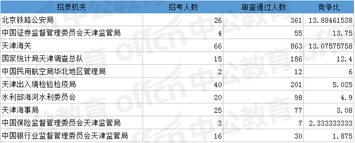 為幫助廣大考生更清晰的了解今日?qǐng)?bào)名情況,中公網(wǎng)校整理了審核通過人數(shù)前十位的部門以及競(jìng)爭(zhēng)比例最激烈的十大部門,供廣大考生參考:
