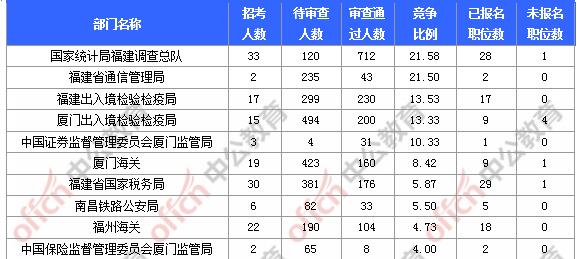 截止到1日16時,通過審核人數前三位的部門依次是:國家統計局福建調查總隊、福建出入境檢驗檢疫局、廈門出入境檢驗檢疫局,三部門通過審核總人數達1142人,占通過審核總人數的63.23%。