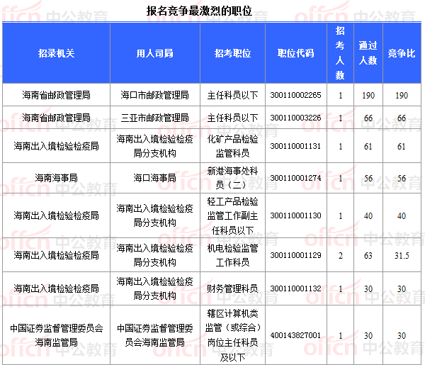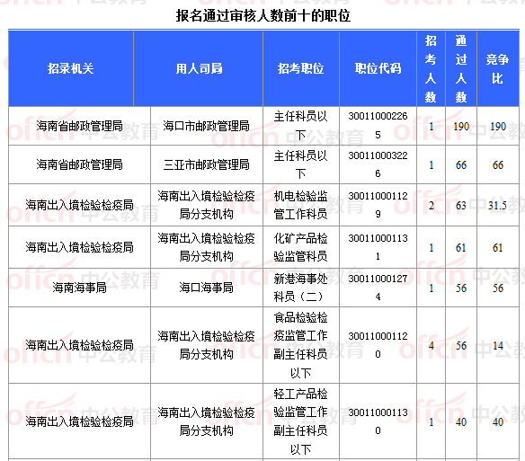 報(bào)名通過審核人數(shù)前十的職位主要集中在海南省郵政管理局、海南出入境檢驗(yàn)檢疫局、海南海事局等部門,具體信息如下: