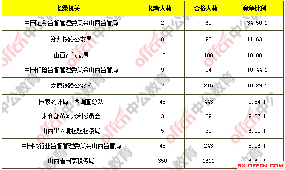 截至11月1日16時(shí),據(jù)中公網(wǎng)校統(tǒng)計(jì),國(guó)考職位中工作地點(diǎn)在山西的職位通過審核總?cè)藬?shù)為3009人,和去年同期相比合格人數(shù)減少了309人,截止目前共有44個(gè)職位無人報(bào)考,平均競(jìng)爭(zhēng)比例為5.67:1,和去年同期競(jìng)爭(zhēng)比基本持平。