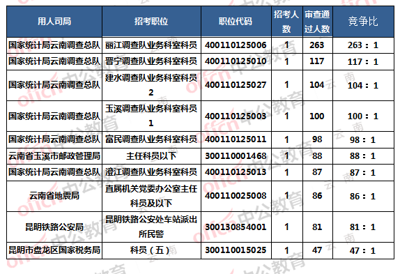 截止11月1日18時,國考報名第三天,國家統計局云南調查總隊,麗江調查隊業務科室科員,職位代碼:400110025006,招錄1人,審查通過人數為263人,具體信息如下: