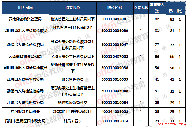 當前最受歡迎的崗位是云南儲備物資管理局,物資管理處主任科員及以下,職位代碼:300110487001 ,招錄1人,82人處于待審狀態,詳情如下圖: