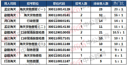 當前孟定海關職位代碼300110014129的崗位相比報名人數為多,招1人,23人報名待審,熱門比為:23:1