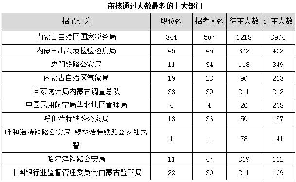 截止到11月1日16時,通過審核人數前三位的部門依次是:內蒙古自治區國家稅務局、內蒙古出入境檢驗檢疫局、沈陽鐵路公安局,三部門通過審核總人數達4655人,占通過審核總人數的73.59%。