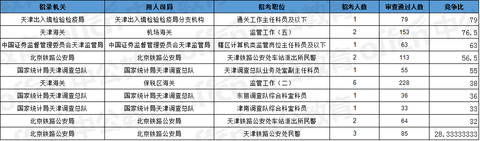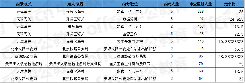 報(bào)名通過(guò)審核人數(shù)前十的職位主要集中在天津海關(guān)、北京鐵路公安局、天津出入境檢驗(yàn)檢疫局等部門,具體信息如下: