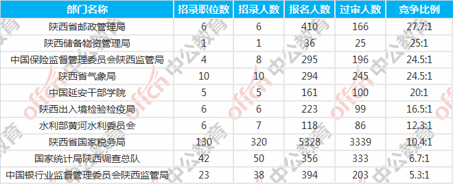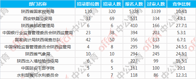 截至11月2日9時,據中公網校統計,國考職位中工作地點在陜西的職位待審核人數為:3213人,通過審核人數為5228人,平均競爭比例為9.4:1。