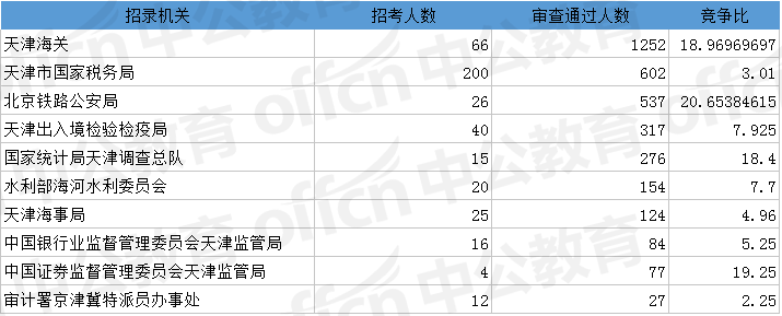 截止到2日16時,通過審核人數前三位的部門依次是:天津海關、天津市國家稅務局、北京鐵路公安局,三部門通過審核總人數達2391人。