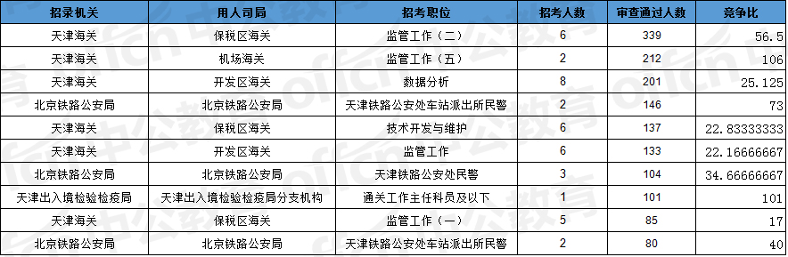 報名通過審核人數前十的職位主要集中在天津海關、北京鐵路公安局、天津出入境檢驗檢疫局等部門,具體信息如下: