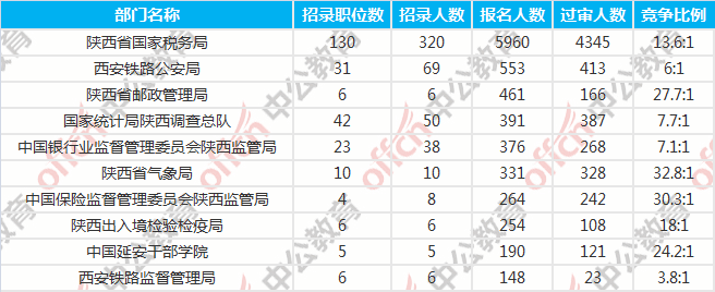 截至到2日16時,通過審核人數前三位的部門依次是:陜西省國家稅務局、西安鐵路公安局、國家統計局陜西調查總隊,三部門通過審核總人數達5145人,占通過審核總人數的77.4%。
