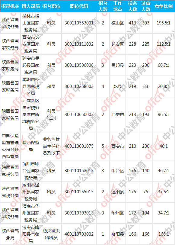 截至到2日16時,競爭比例的職位為陜西省榆林市橫山區國家稅務局科員一職,招錄2人,截至到2日16時報名人數為413人,通過審核人數為393人,競爭比例196.5:1!