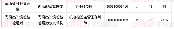 報(bào)名通過審核人數(shù)前十的職位主要集中在海南省郵政管理局、海南出入境檢驗(yàn)檢疫局、海南海事局等部門,具體信息如下: